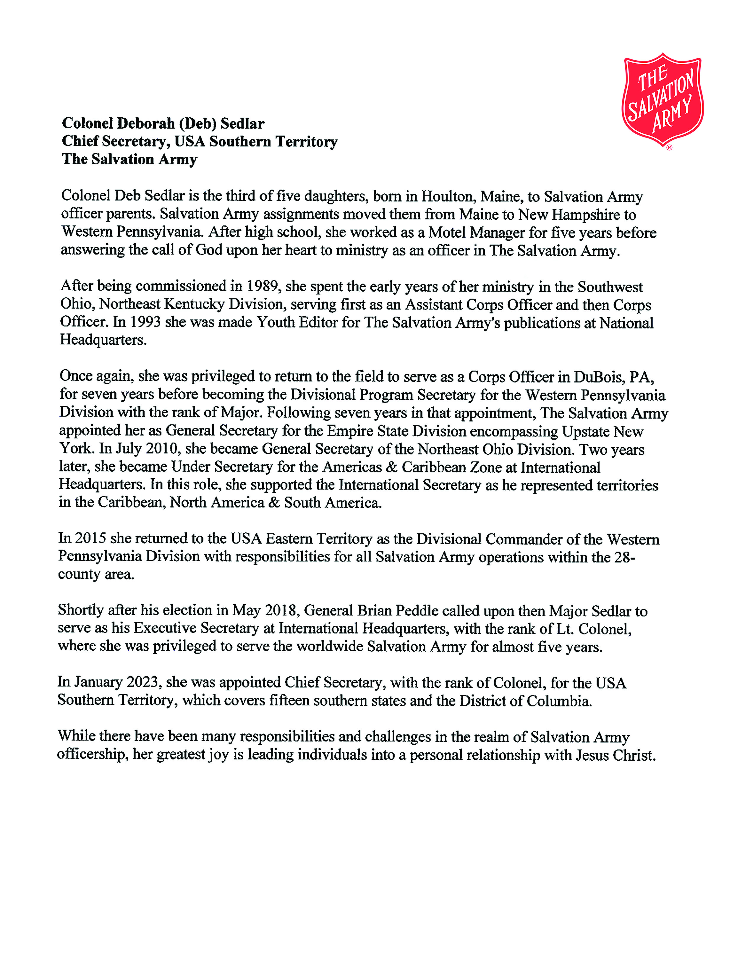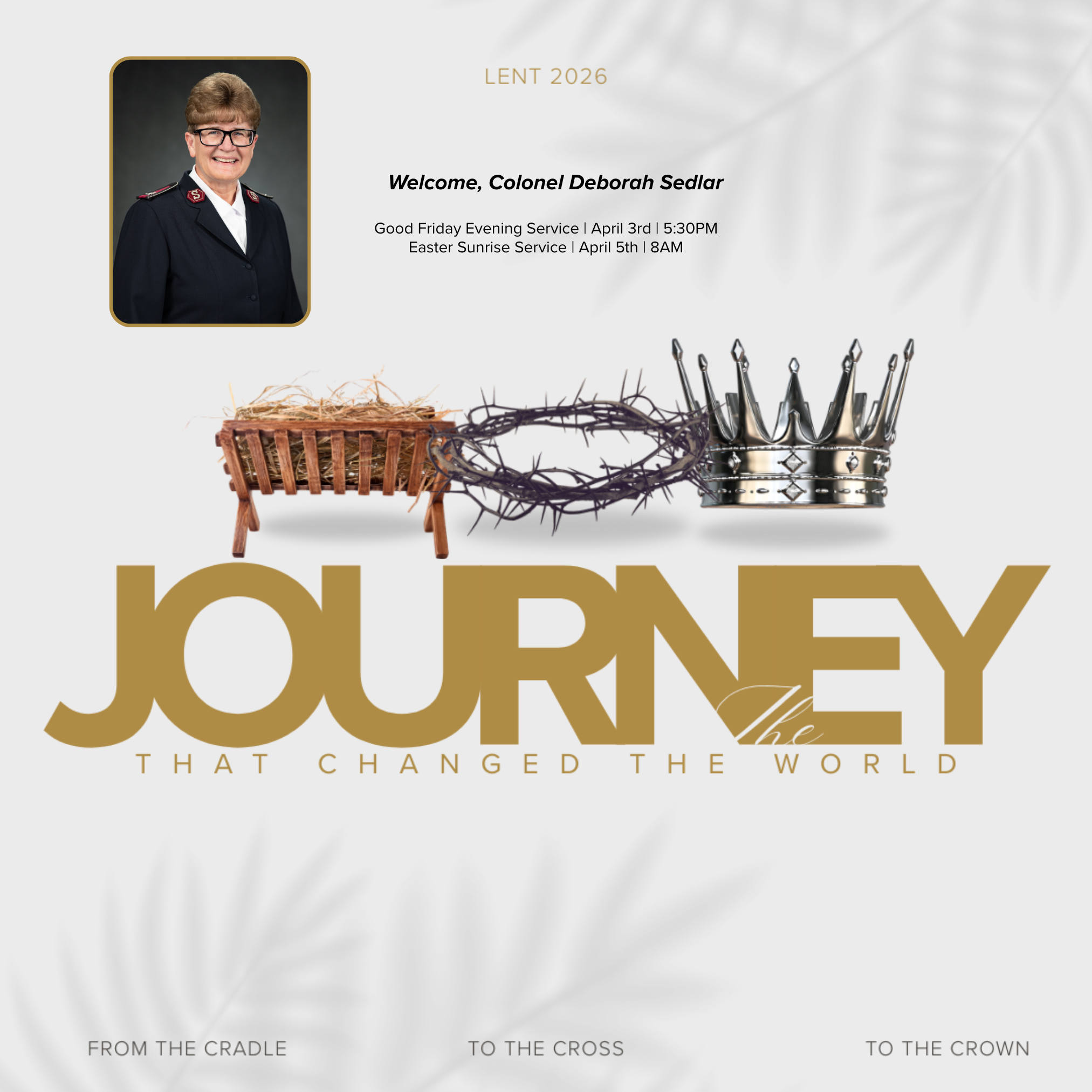 We are honored to welcome Colonel Deborah Sedlar, The Salvation Army’s USA Southern Territory Chief Secretary, to our chapel for these special worship and fellowship opportunities. Easter Sunday begins with a sunrise service, followed by breakfast at 9AM, Holiness Meeting at 10AM, and an egg hunt for the kids at 11AM.